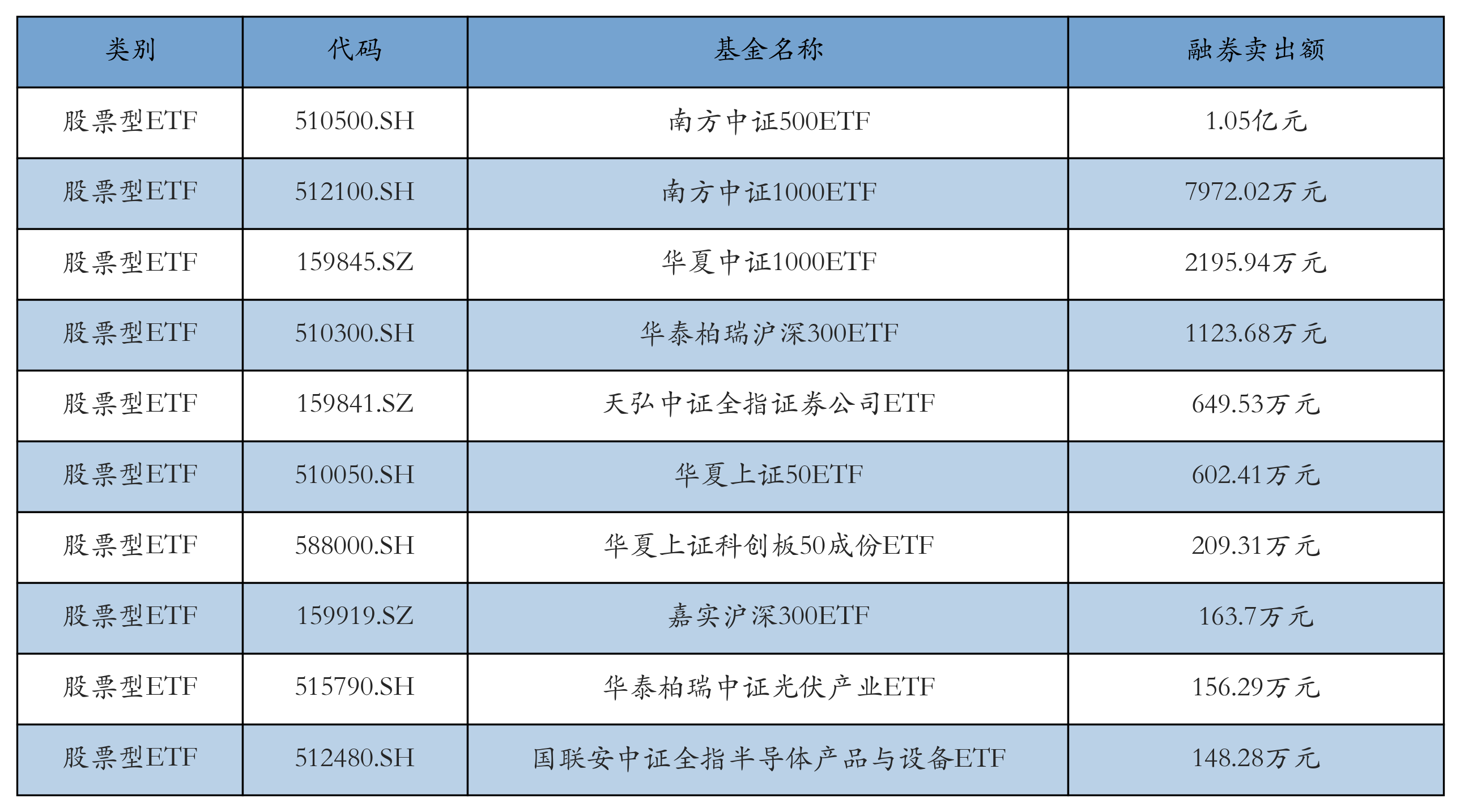 昨日股票型ETF融资卖出额最高的3只ETF及其卖出金额分别为:南方中证500ETF(1.05亿元)、南方中证1000ETF(7972.02万元)、华夏中证1000ETF(2195.94万元)。融券卖出额前10详情见下表: