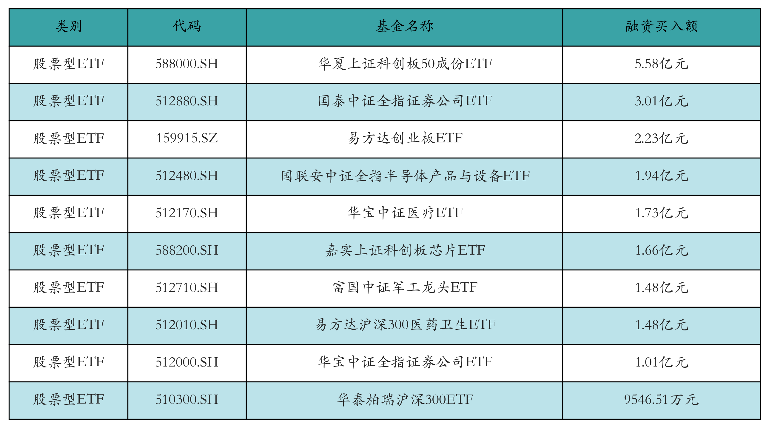 昨日股票型ETF融资买入额最高的3只ETF及其买入金额分别为:华夏上证科创板50成份ETF(5.58亿元)、国泰中证全指证券公司ETF(3.01亿元)、易方达创业板ETF(2.23亿元)。融资买入额前10详情见下表: