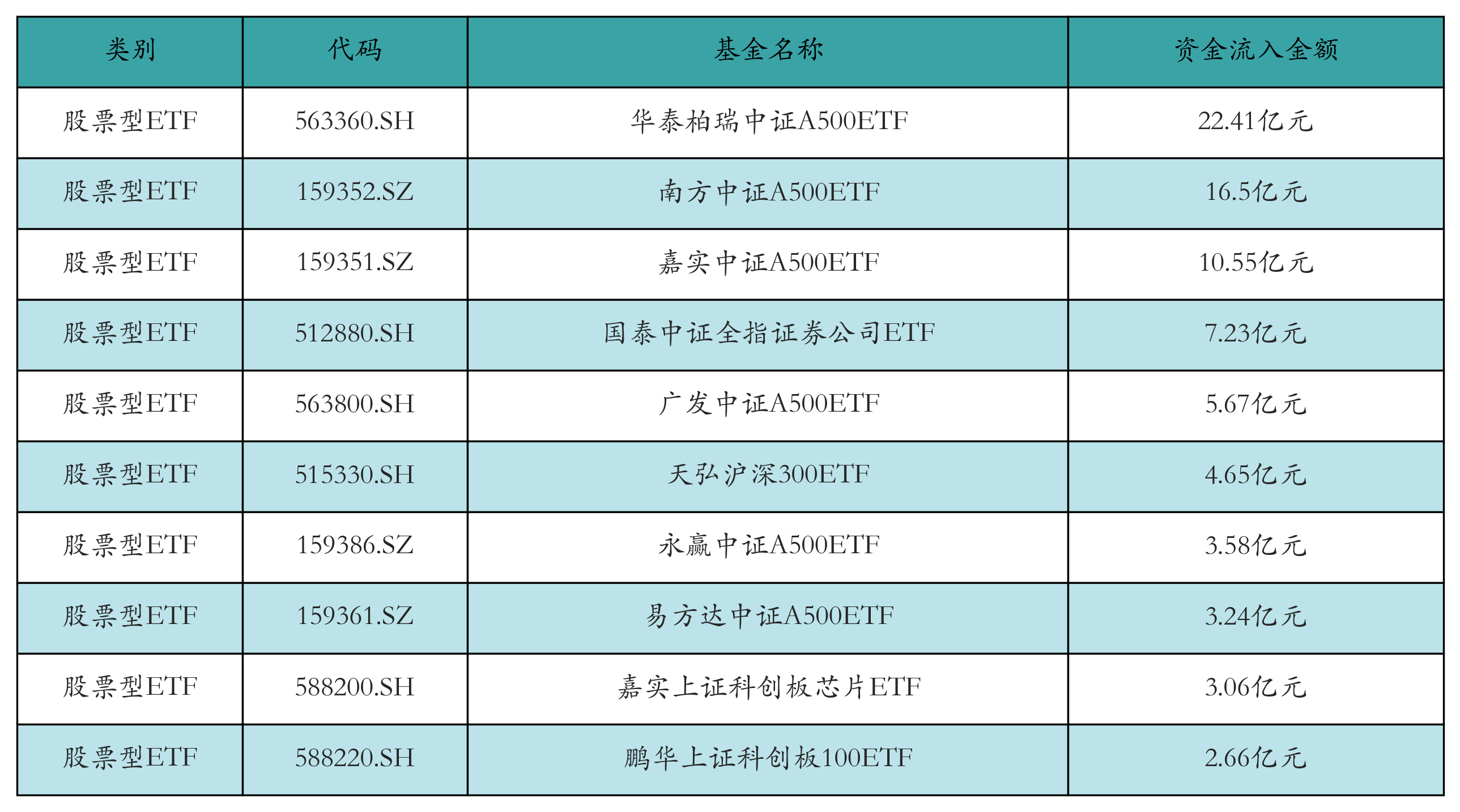 昨日股票型ETF资金流入最多的3只ETF及其流入金额分别为:华泰柏瑞中证A500ETF(流入22.41亿元)、南方中证A500ETF(流入16.5亿元)、嘉实中证A500ETF(流入10.55亿元)。资金流入前10详情见下表: