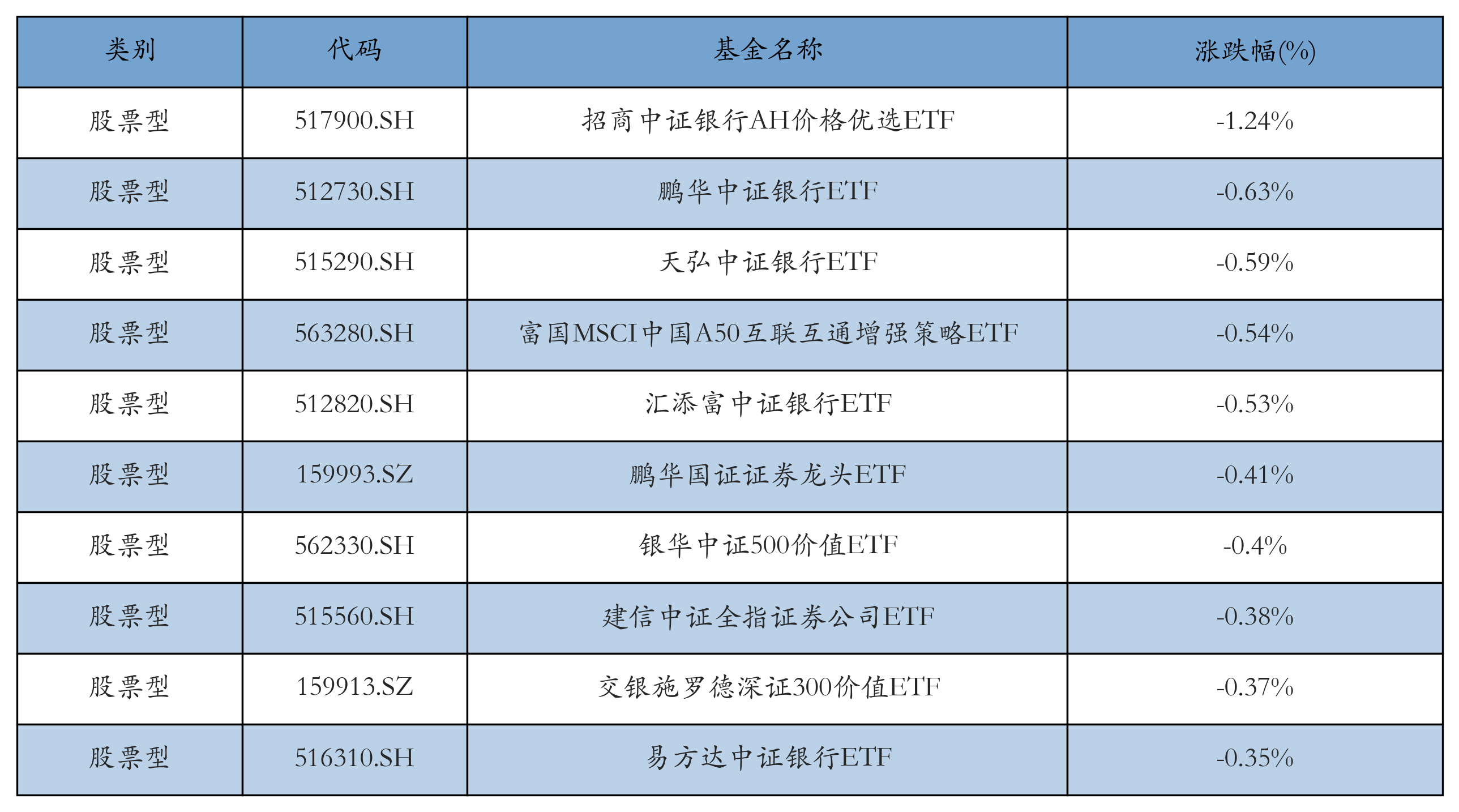 昨日股票型ETF跌幅最大的3只ETF及其收益率分别为:招商中证银行AH价格优选ETF(-1.24%)、鹏华中证银行ETF(-0.63%)、天弘中证银行ETF(-0.59%)。跌幅前10详情见下表: