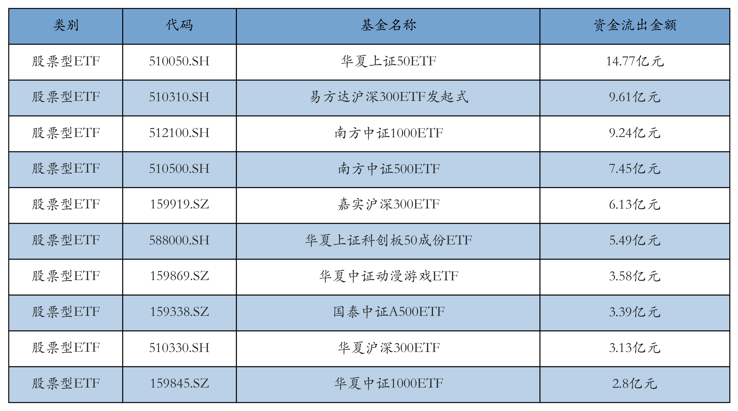 昨日股票型ETF资金流出最多的3只ETF及其流出金额分别为:华夏上证50ETF(流出14.77亿元)、易方达沪深300ETF发起式(流出9.61亿元)、南方中证1000ETF(流出9.24亿元)。资金流出前10详情见下表: