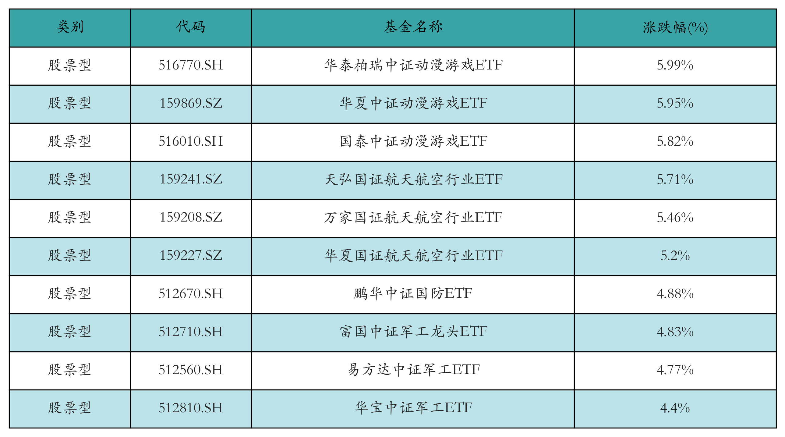 昨日股票型ETF涨幅最高的3只ETF及其收益率分别为:华泰柏瑞中证动漫游戏ETF(5.99%)、华夏中证动漫游戏ETF(5.95%)、国泰中证动漫游戏ETF(5.82%)。涨幅前10详情见下表: